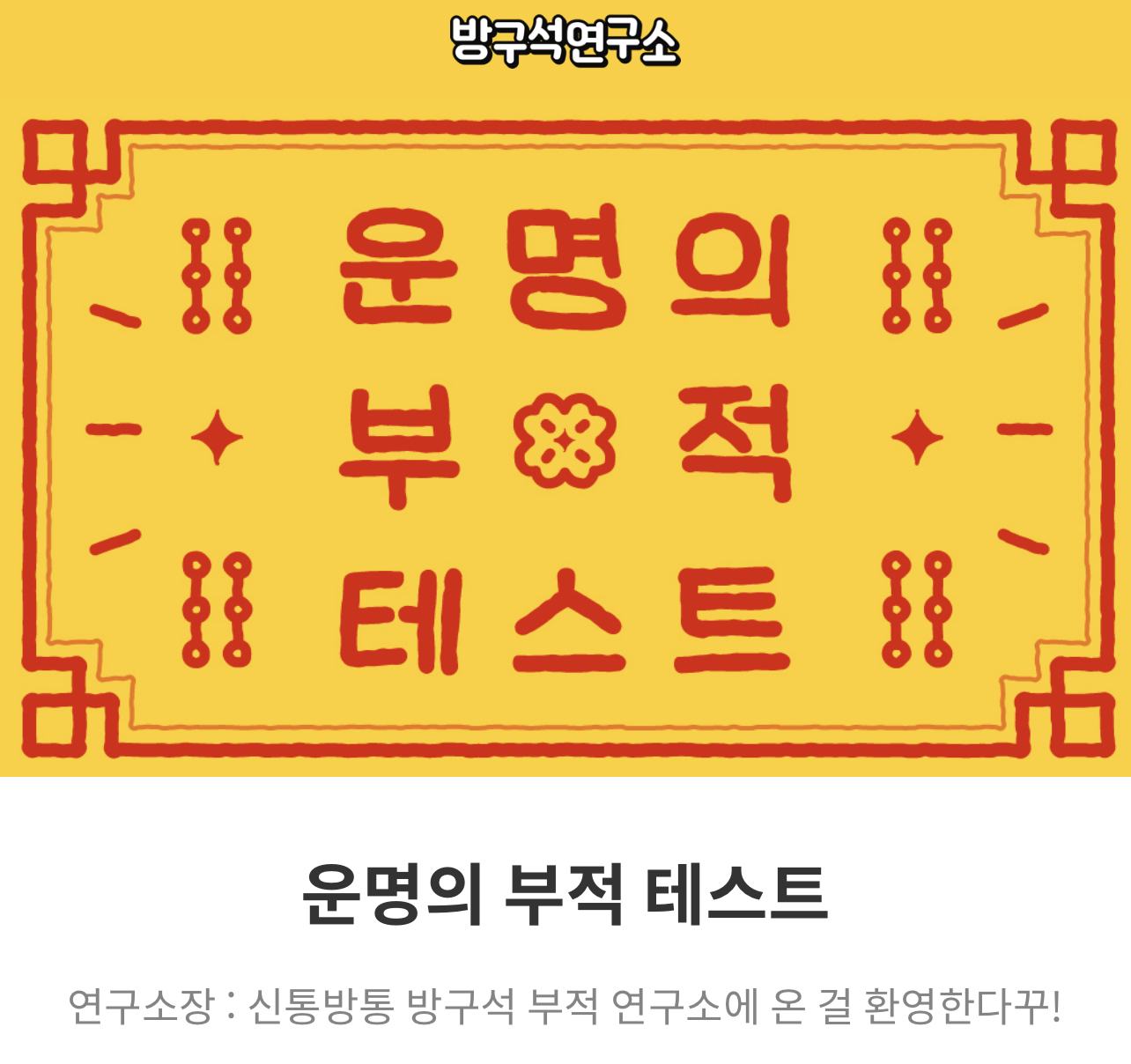 부적이란 잡귀를 쫓고 재앙을 물리치기 위하여 붉은색으로 글씨를 쓰거나 그림을 그려 몸에 지니거나 집에 붙이는 종이를 말하는데 이번에 여러가지 다양한 테스트를 제공하는 방구석 연구소에서 “운명의 부적 테스트”가 새롭게 나와서 소개드리려고 합니다.