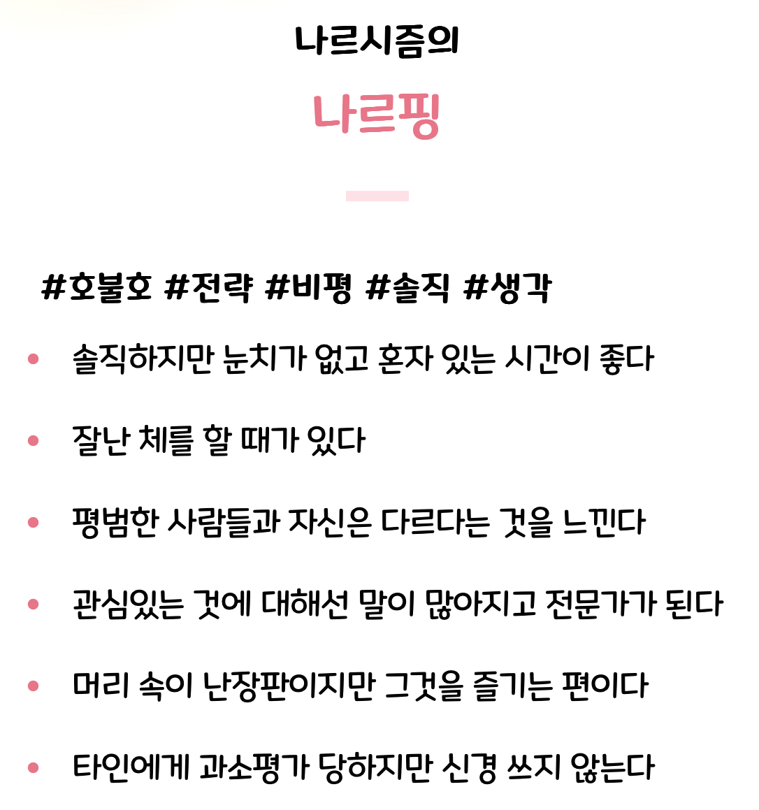 • 솔직하지만 눈치가 없고 혼자 있는 시간이 좋다
