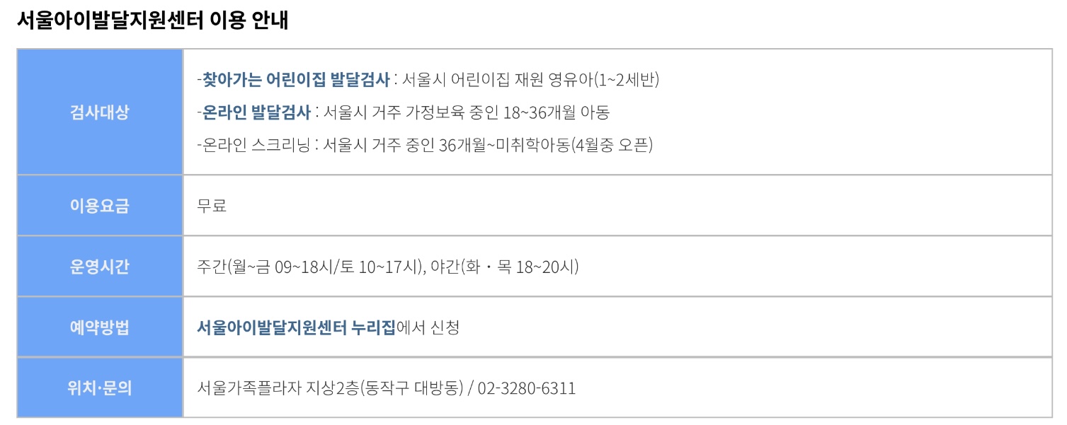 서울시는 이용자 의견을 반영해 2025년 올해부터 ▲검사 연령 확대 ▲‘온라인 스크리닝’ 검사 도입 ▲1:1 ‘발달도움 코칭’ 프로그램 신설 ▲‘발달놀이터’ 운영 확대로 센터 기능을 강화한다고 합니다.