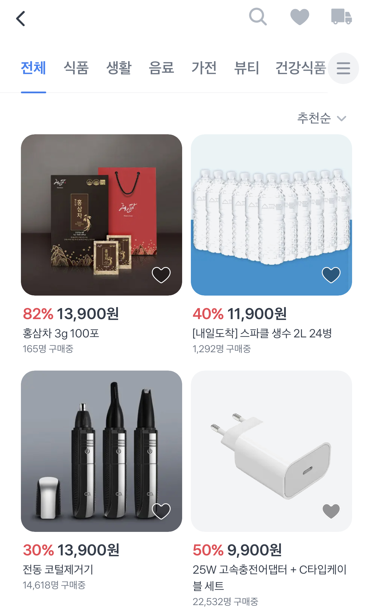 종류는 식품, 생활, 음료, 가전, 뷰티, 건강식품, 패션, 반려동물, 자동차용품, 문화•취미, 유아동, 기타 등등 다양한 상품을 볼 수 있습니다.