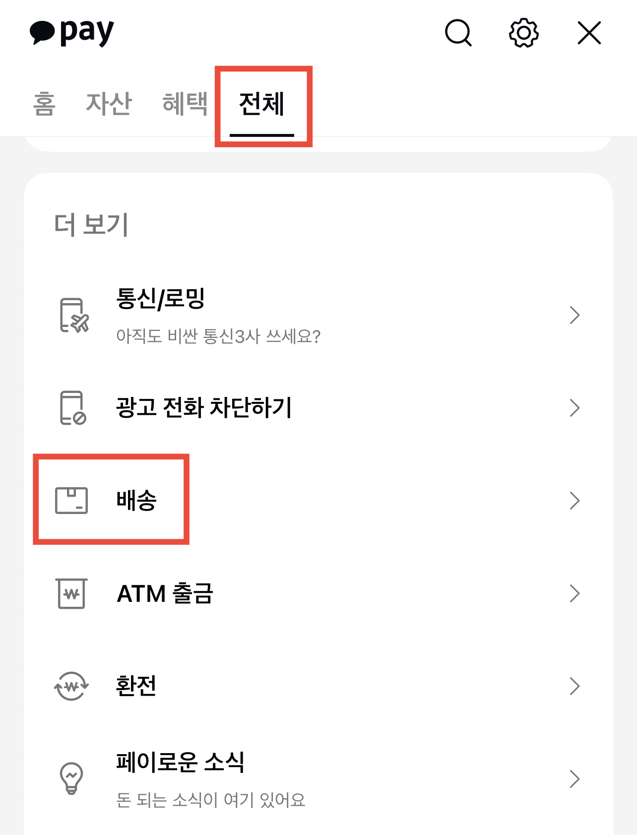 2. 전체 메뉴를 누르고 스크롤을 내리다보면 배송이라는 문구가 보이면 해당 탭을 클릭하시길 바랍니다.
