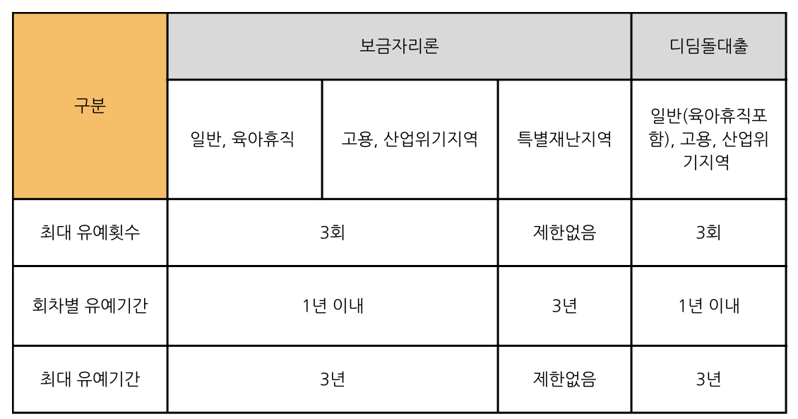 위 표에 나와있는것처럼 보금자리론, 디딤돌대출의 원금상환 최대 유예 횟수는 모두 3회, 회차별 유예기간은 1년 이내이며 최대 유예기간은 3년입니다.
