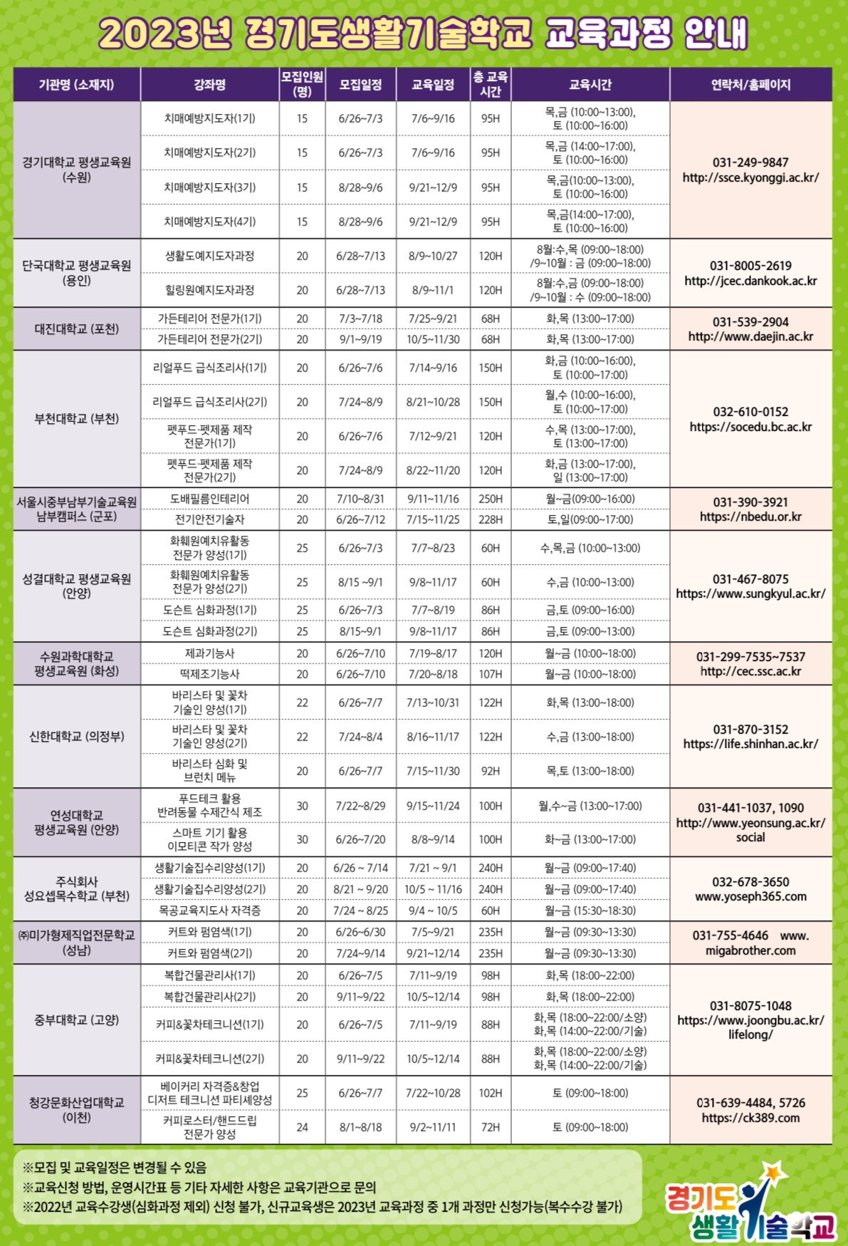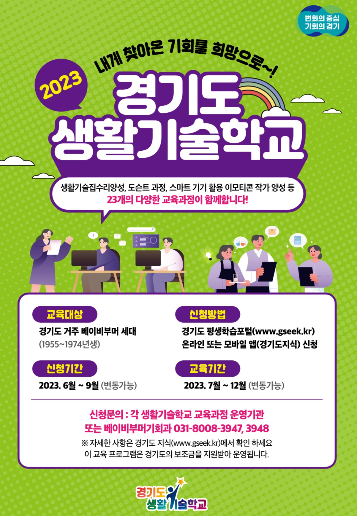 경기도내 베이비부머의 제2인생 준비와 취·창업 등을 통한 경제적 노후준비, 지속적 사회참여 기회를제공하기 위하여 경기도생활기술교육 참여자를 아래와 같이 모집한다는데 많은 참여 부탁한다고 밝혔습니다.