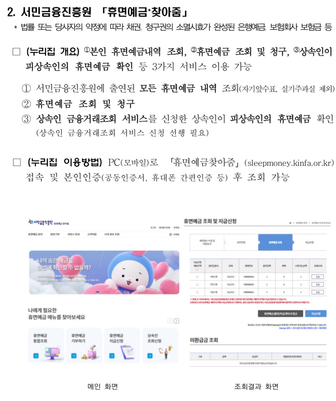 이에 따라 고령소비자를 대상으로 한 전용 안내장을 별도로 마련하여 주요 내용(미수령금액, 적립 이자율, 고객센터 연락처 등)을 첫페이지에 기재하고 글자크기를 확대하는 등 가독성을 높이고 연 1회 이상 우편을 발송