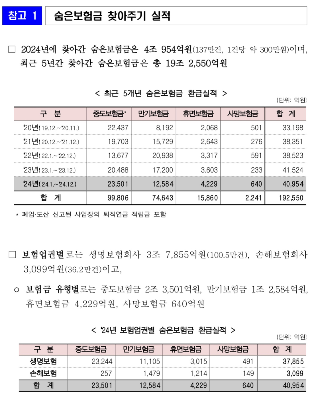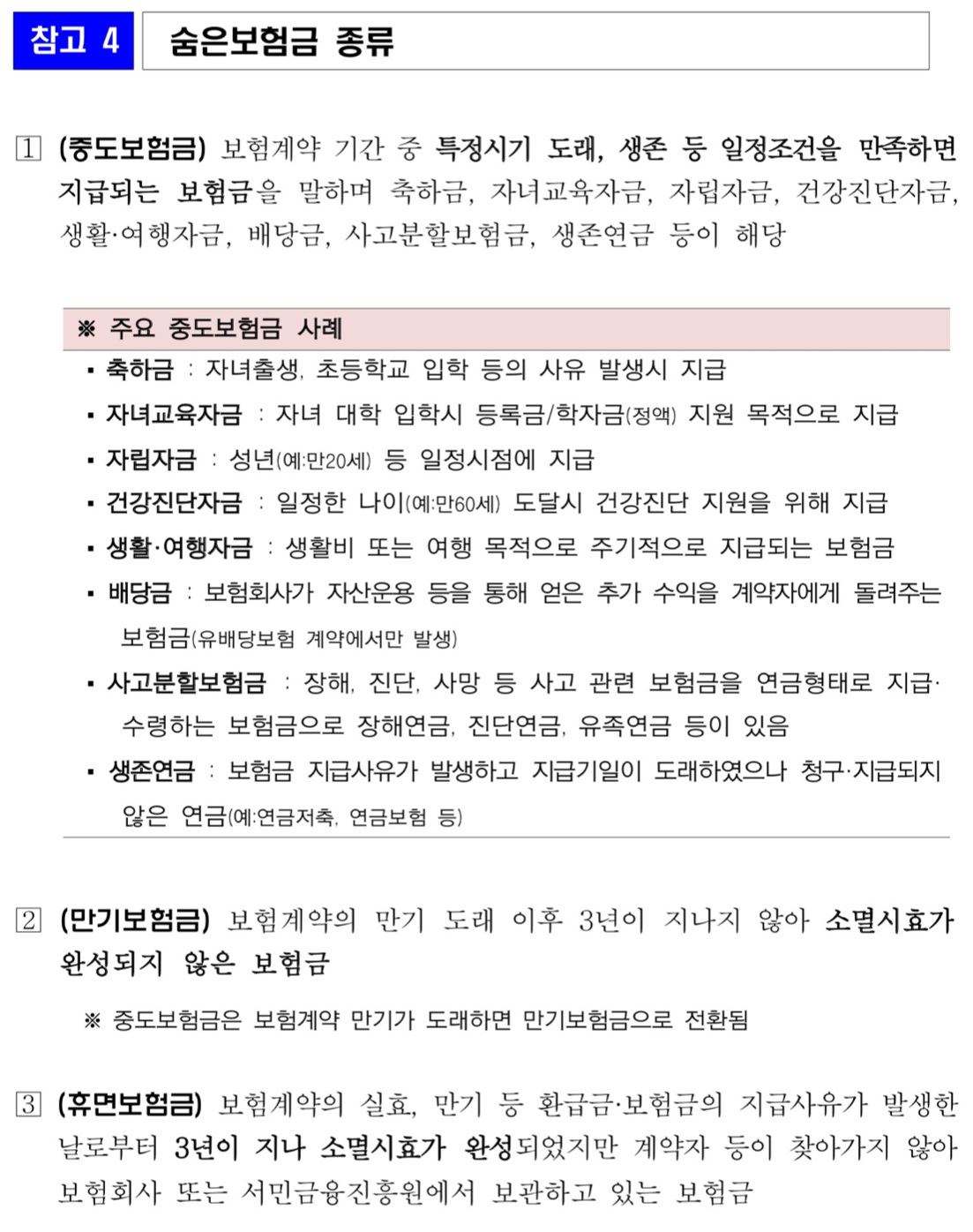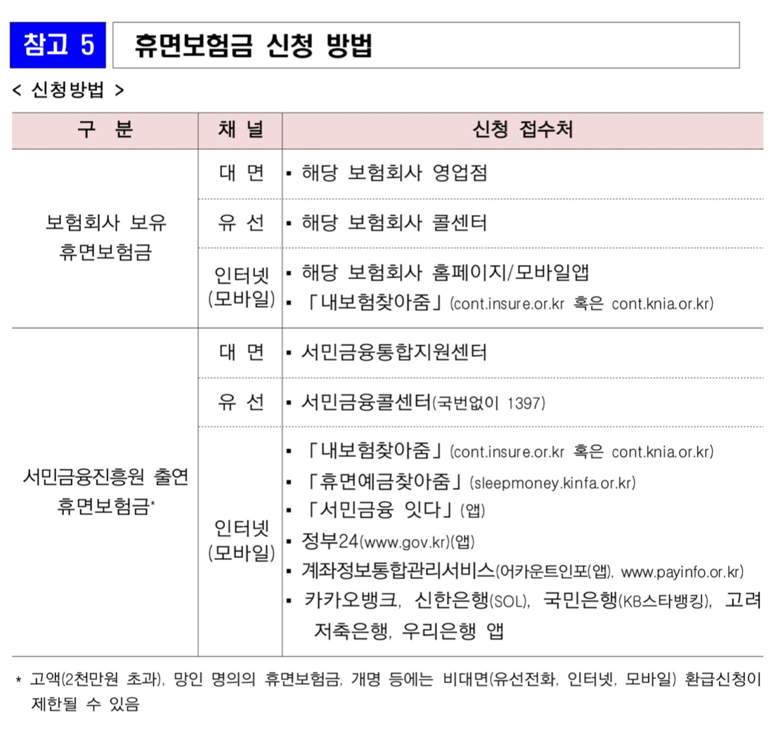 * 보험계약 만기도래, 중도보험금 및 휴면보험금 발생, 사업장 폐업·도산 후 찾아가지 않은 퇴직연금 적립금(미청구 적립금) 발생 등