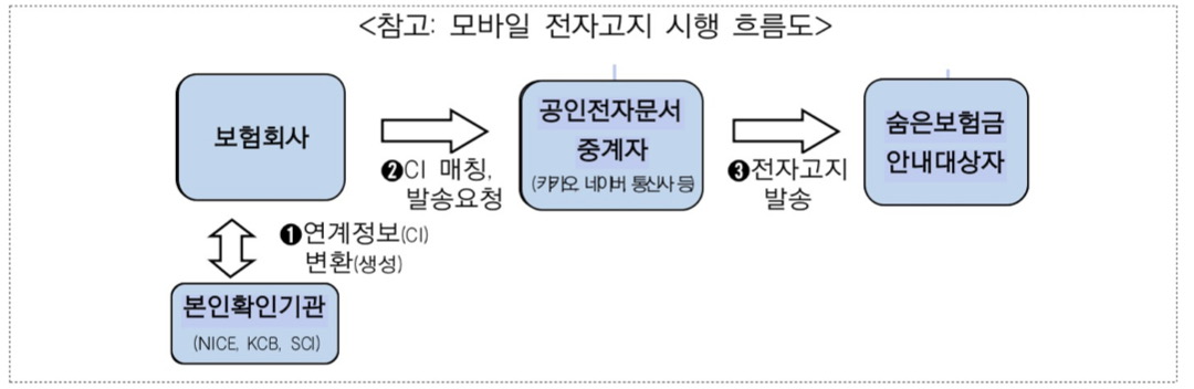 금번에는 본인확인을 한 번도 시도하지 않아 연계정보(CI)가 없었던 고령자·금융취약계층 등에게도 방송통신위원회 및 한국인터넷진흥원(KISA)의 연계정보(CI) 변환심사를 통해 CI를 일괄변환하여 모바일 전자고지를 할 수 있도록 하여 숨은보험금 현황과 환급 방법을 안내할 계획이라고 합니다.