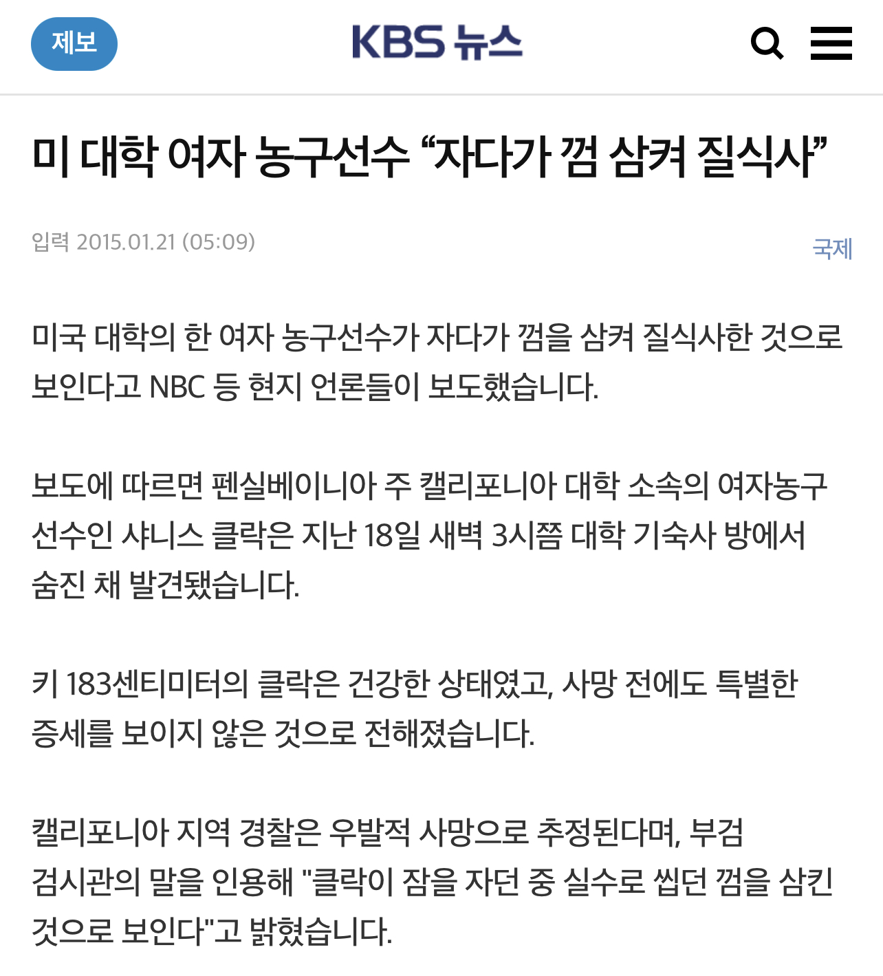 위 KBS기사처럼 미국 대학의 한 여자 농구선수가 자다가 껌을 삼켜 질식사한 것으로 보인다고 NBC 등 현지 언론들이 보도한 바가 있습니다.