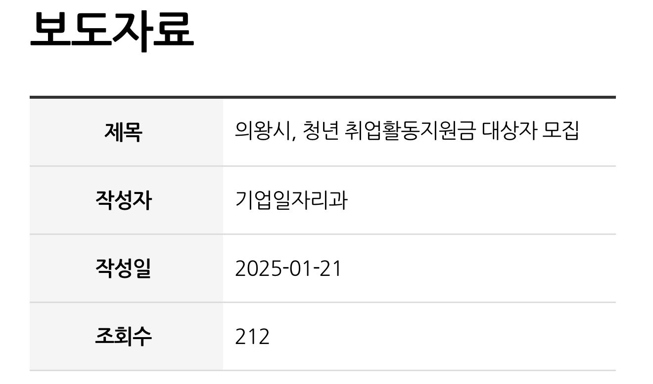 지원 항목 및 자격 조건 등 세부 사항은 의왕시 홈페이지(고시·공고)를 확인하거나, 기업일자리과 일자리청년팀(031-345-2714)으로 문의하시면 됩니다.