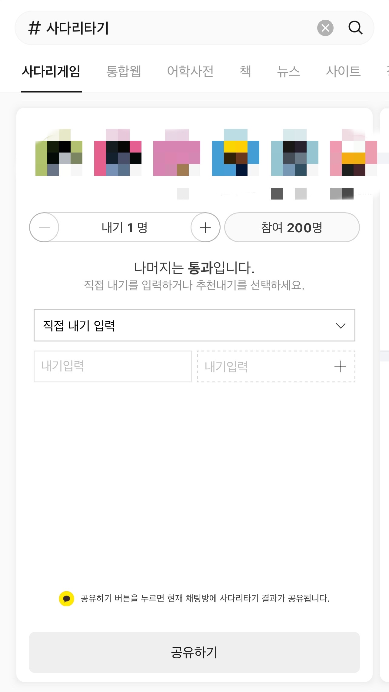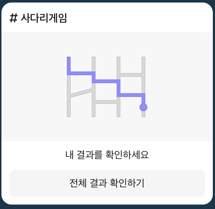 4. 공유하기를 눌러주시면 카톡방에 사다리타기 게입이 전송되는데 전체결과 확인하기를 통해서 결과를 볼 수 있습니다.