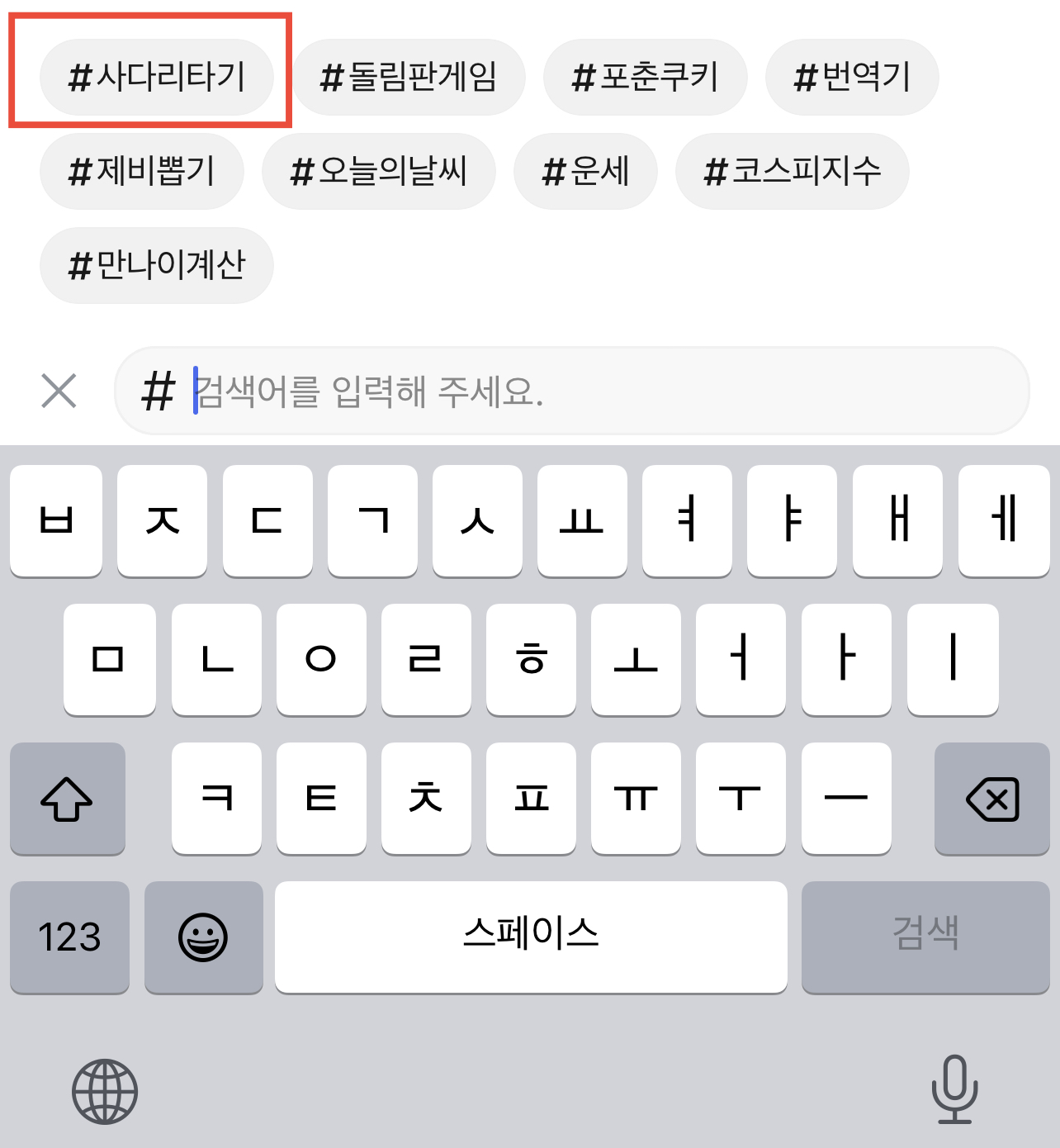 2. #버튼을 누르면 사진처럼 “사다리타기”가 바로 보이지만 만약 뜨지 않는 경우 검색창에 “사다리타기”를 검색하셔도 됩니다.