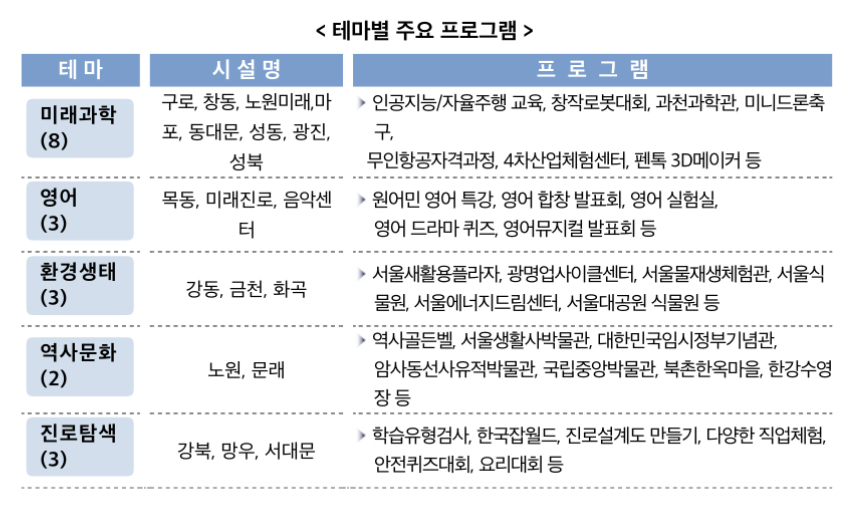 이번 청소년 동행캠프는 2023년 7월 31일(월)부터 8월 11일(금)까지 2주간 서울시내 시립청소년시설 19개소(청소년센터 16개소, 미래진로센터 2개소, 음악센터 1개소)에서 진행되며 ▲미래과학 ▲영어 ▲역사문화 ▲환경생태 ▲진로탐색 등 지역 특성 및 청소년의 관심사에 맞춰 분야별로 다채로운 프로그램을 제공할 예정이라고 합니다.