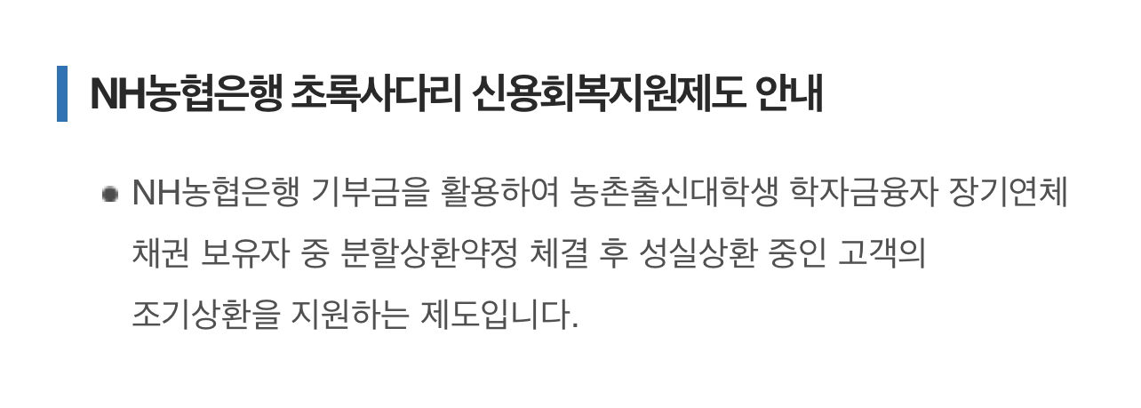 NH농협은행 기부금을 활용하여 농촌출신대학생학자금융자(대출) 장기연체고객의 조기 상환을 지원하고 상환 부담 경감과 경제적 재기를 돕는 NH농협은행 초록사다리 신용지원사업이 있다고 하는데 어떤 내용이고 신청 대상자는 누구인지 알아보는 시간을 가져보겠습니다.
