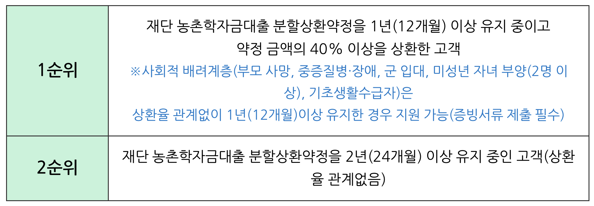 (1순위) 분할상환약정을 1년(12개월) 이상 유지 중으로 약정금액의 40%이상을 상환한 자