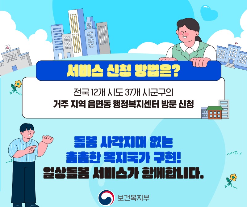해당 지역에 거주하는 주민 중 일상돌봄 서비스를 이용하고자 하는 사람은 거주 지역 읍·면·동 행정복지센터에 방문해 신청하면 되며 보건복지부는 하반기에 6000명 이상을 지원하는 것을 목표로 세웠다고 합니다.