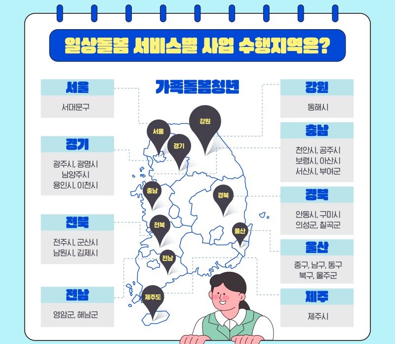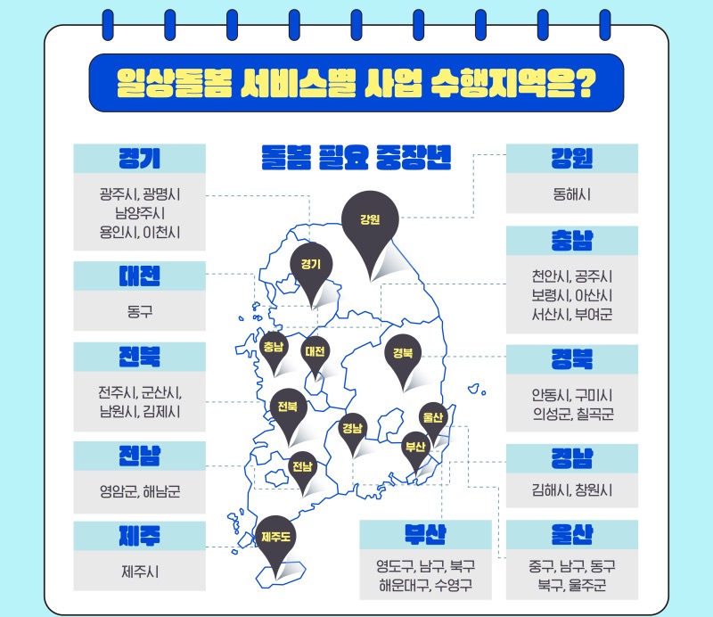 일상돌봄 서비스는 모든 사업 수행지역이 공통적으로 제공하는 기본 서비스인 재가 돌봄·가사 서비스와 각 지역이 지역의 수요·여건을 반영해 자체적으로 기획·제공하는 특화 서비스 두 가지로 나뉩니다.