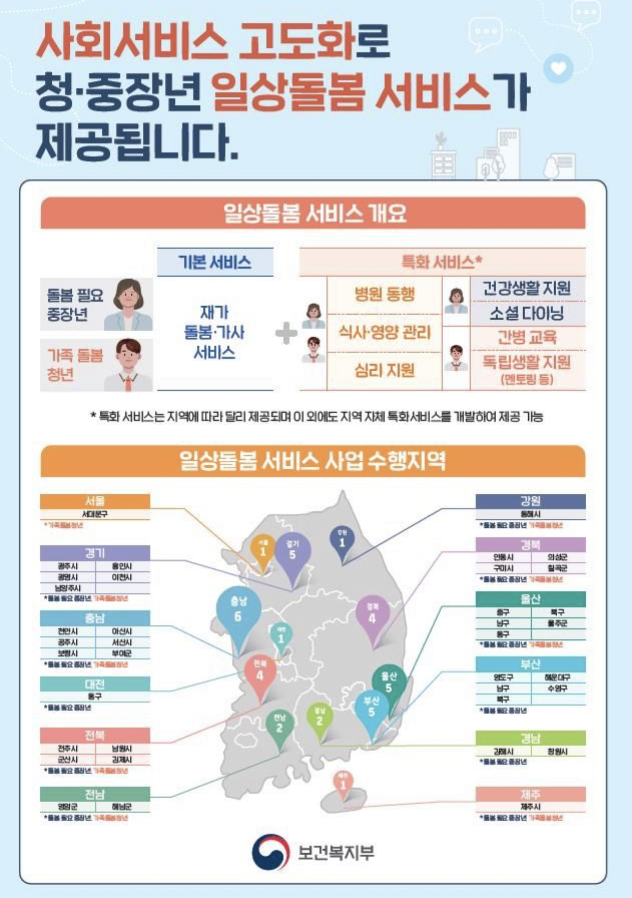 질병이나 부상, 고립 등으로 돌봄이 필요한 중장년과 가족돌봄청년도 정부·지자체로부터 돌봄·가사, 병원 동행 등 사회서비스를 받을 수 있게 됩니다.