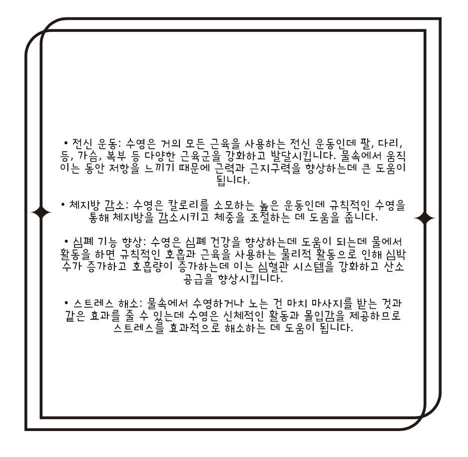 • 체지방 감소: 수영은 칼로리를 소모하는 높은 운동인데 규칙적인 수영을 통해 체지방을 감소시키고 체중을 조절하는 데 도움을 줍니다.