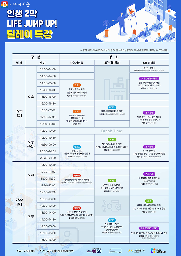 서울시평생교육진흥원은 생애전환기 미래설계에 도움이 되는 강의를 모은 ‘인생2막 라이프 점프 업(Life Jump Up)! 릴레이 특강’을 진행하고 2023년 6월 26일부터 참여자를 모집하고 있습니다.