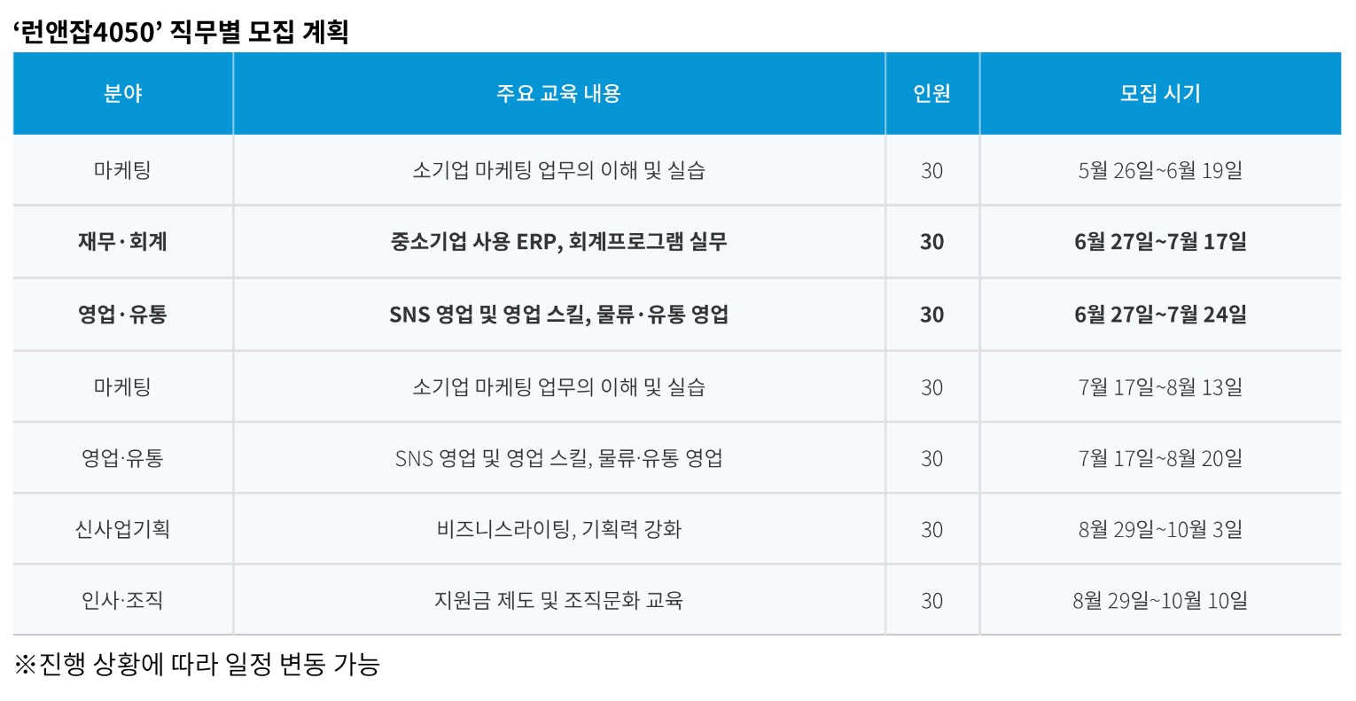 ‘런앤잡4050’은 직무 경력을 살려 이직하고 싶은 서울시 4050 세대를 대상으로 한다. 현재 재무·회계 분야(6.27.~7.17.)와 영업·유통 분야(6.27.~7.24.) 참여자를 모집 중입니다.
