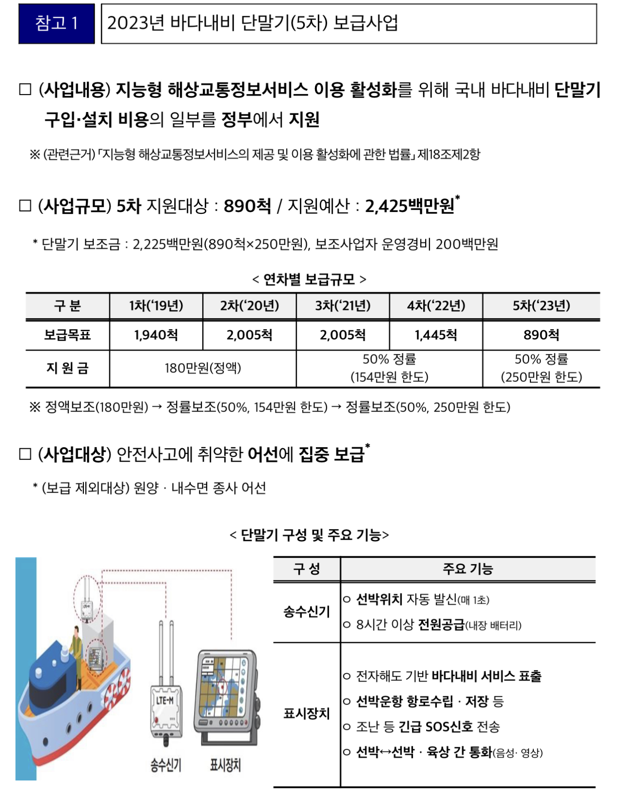 이번 5차 단말기 보급사업에 따라 2023년 7월 3일부터는 기존의 톤수 제한(2톤 이상) 없이 어업인의 단말기 구입을 지원한다고 합니다.