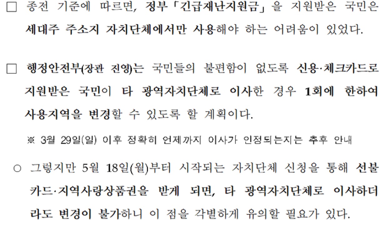 "정부 긴급재난지원금 이사한 지역에서 사용 가능"