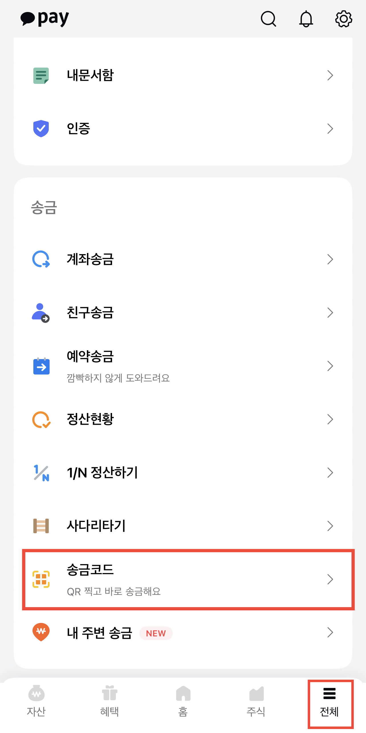 2. 하단에 전체 클릭 후 송금 탭에 “송금코드”클릭