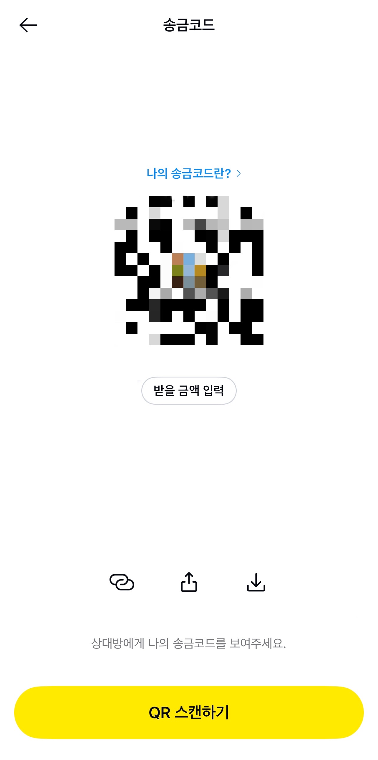 송금코드 바로 아래에 있는 링크 아이콘을 통해 송금링크를 복사하거나 공유하실 수 있습니다.