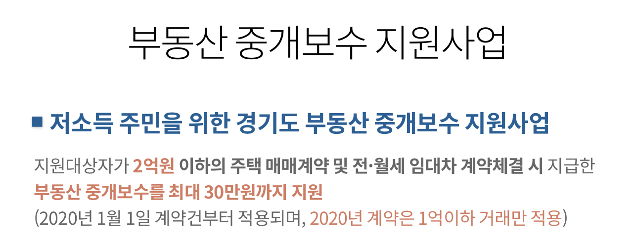 경기도 부동산 중개보수 지원사업이란 저소득 주민을 위한 경기도 부동산 중개보수 지원사업인데 지원대상자가 2억원 이하의 주택 매매계약 및 전·월세 임대차 계약체결 시 지급한 부동산 중개보수를 최대 30만원까지 지원(2020년 1월 1일 계약건부터 적용되며 2020년 계약은 1억이하 거래만 적용)