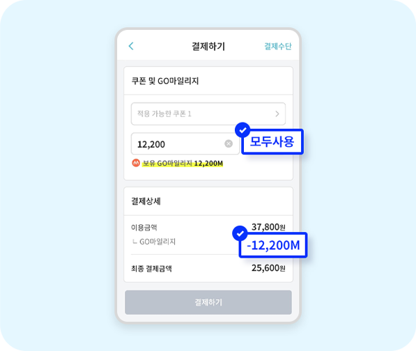 보유 중인 GO마일리지는 모두 사용 또는 분할 사용이 가능하니 결제 시 내가 원하는 만큼 사용해 보시길 바랍니다.