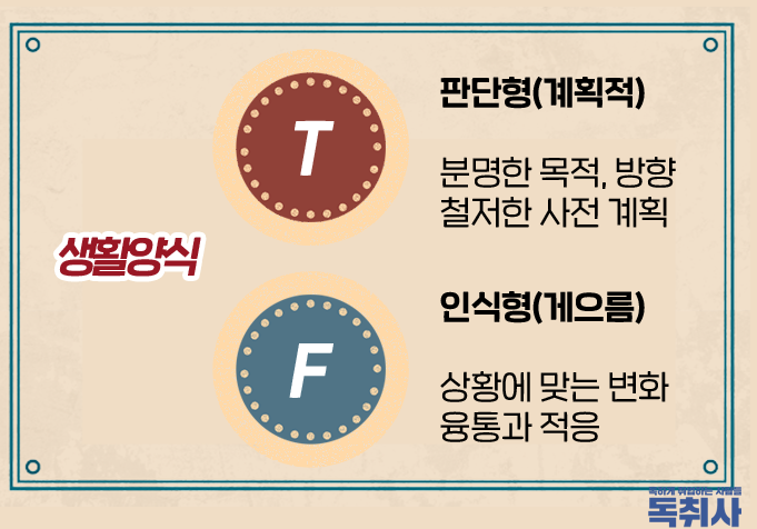 •사고-감정(T-F) : 수집한 정보를 토대로 합리적으로 판단하고 결정 내리는 지표