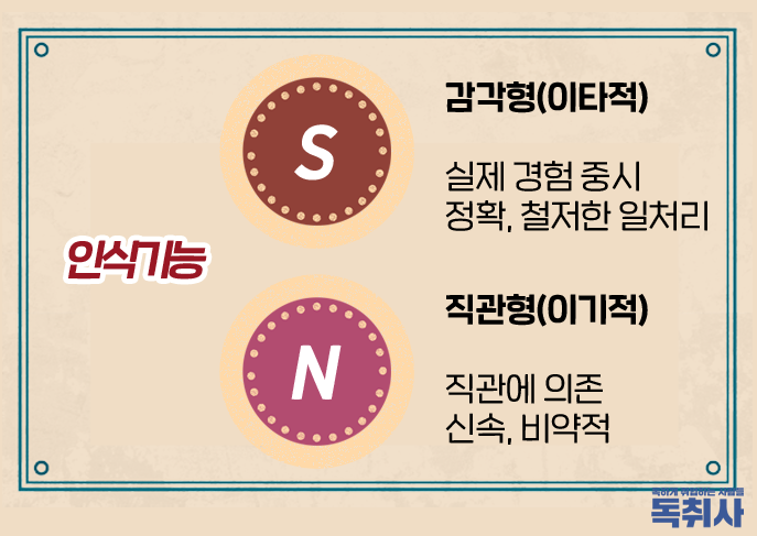 •감각-직관(S-N) : 정보 수집을 포함한 인식의 기능을 나타내는 지표