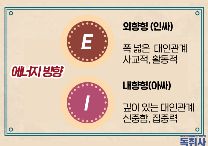 •외향-내향(E-I) : 정신적 에너지의 방향성을 나타내는 지표