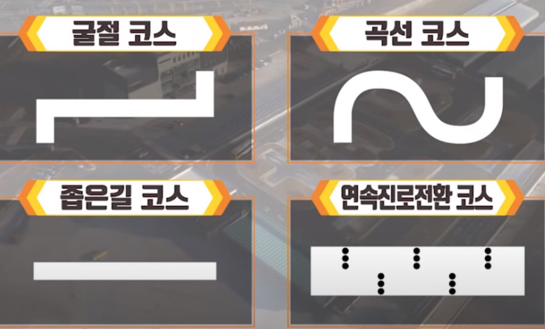 마지막으로 기능시험을 응시해야 하는데 기능시험은 굴절 코스, 곡선 코스, 좁은길 코스, 연속진로전환 코스로 이어집니다.