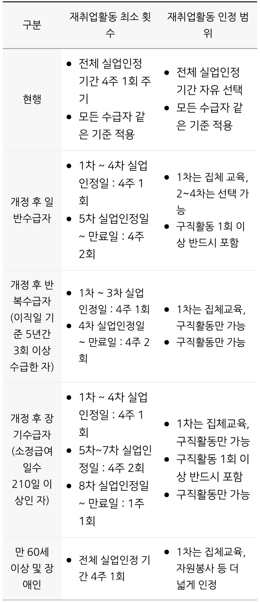 7월부터는 일반 수급자의 경우 4차 실업인정일까지는 4주에 1회 이상만 재취업활동을 하면 되지만, 5차부터는 월 2회 이상 재취업활동에 참여 해야 합니다. 또 반복·장기수급자에 대한 요건도 강화돼 차수에 따라 재취업활동 횟수도 늘어납니다. 반면, 만 60에 이상과 장애인 수급자에 대해서는 수급 기준이 종전보다 완화됩니다.