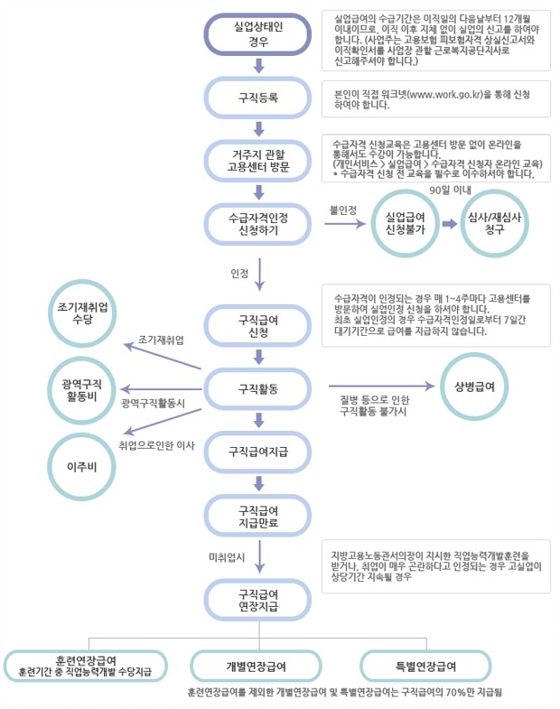 수급기간(퇴직 후 1년)이 경과하거나 재취업하면 구직급여가 지급되지 않기 때문에 퇴직 후 지체 없이 거주지 관할 고용센터에 방문하여 실업신고(구직등록은 전산망을 통해 직접신청)를 해야 합니다.