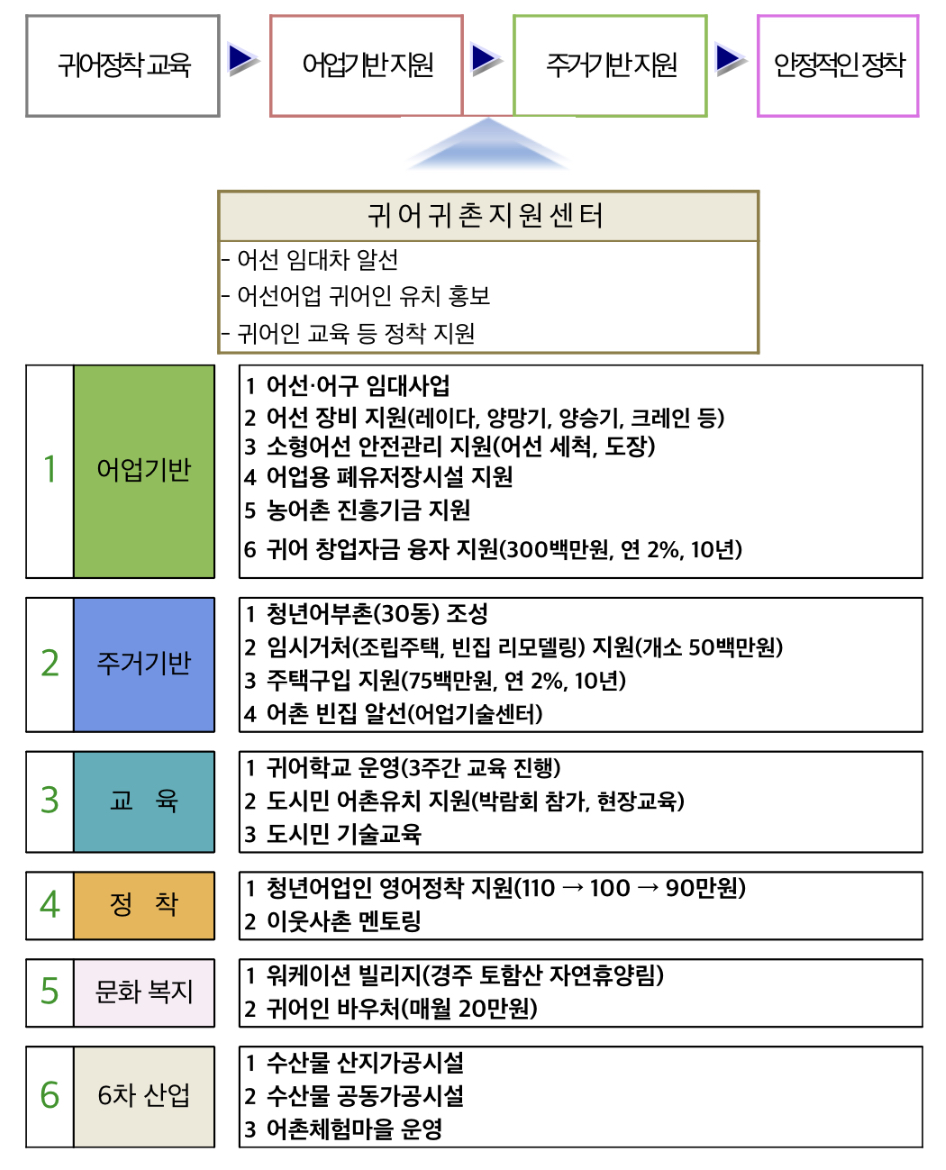 어선어업은 일반인이 쉽게 접근하기 어려운 특수직종임을 감안해 경험이 풍부한 어업인이 일정기간 동안 어선운영에 필요한 노하우를 현장에서 직접 전수해주고 거주 공간이 없는 사람에게는 임시 거주공간을 제공해 주거나 주택 구입(건립)비를 지원해줄 계획이라고 합니다.