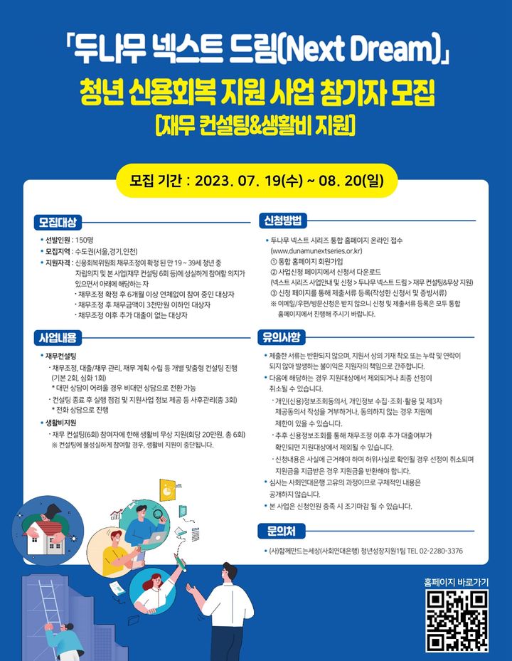 신청자는 이달 2023년 7월 19일부터 내달 2023년 8월 20일까지 총 150명을 모집하며 신청자 조건은 채무 조정이 확정된 만 19세 이상 39세 이하 청년 중 수도권(서울·경기·인천)에 거주하고 있는 사람입니다.