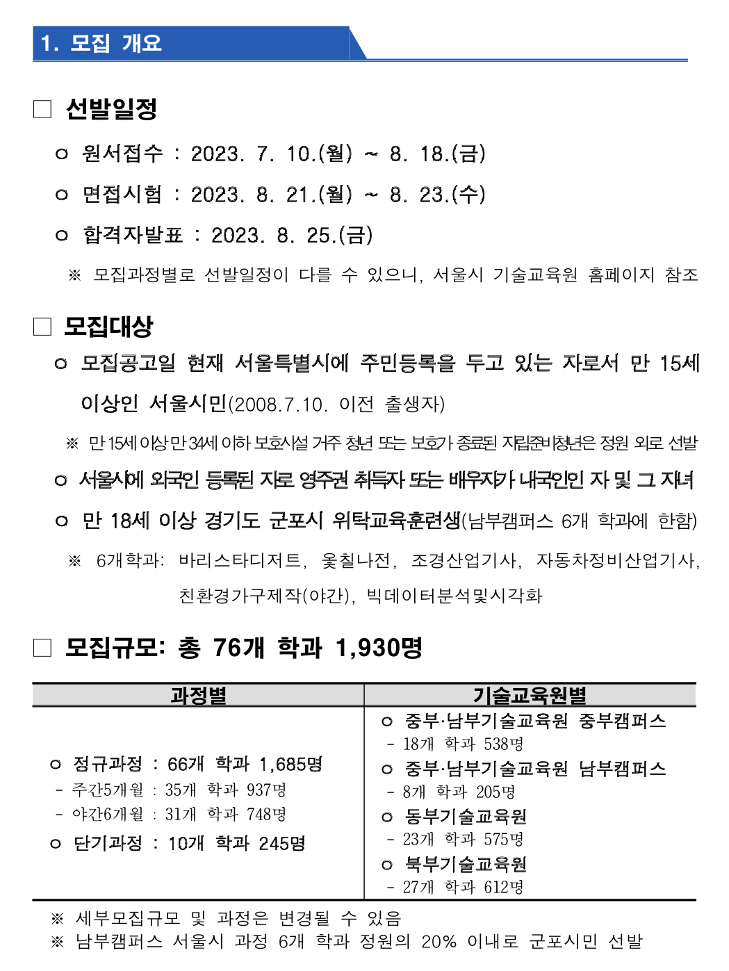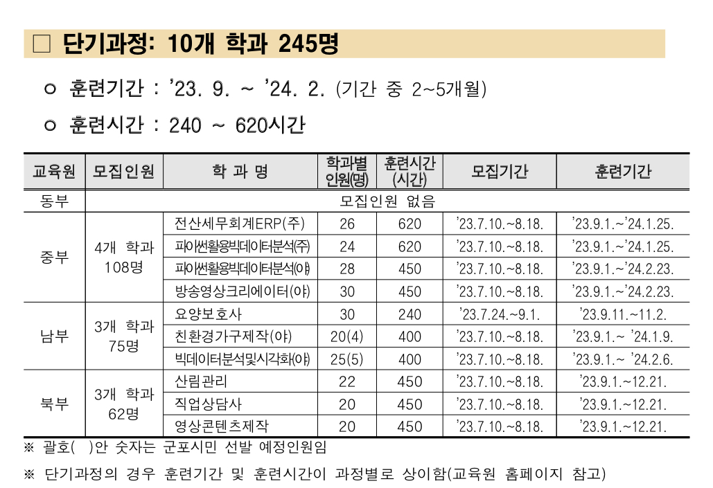 이번 하반기 모집은 ▴정규과정(주간 5개월, 야간 6개월) 66개 학과 1,685명과 ▴단기과정 10개 학과 245명 등 총 76개 학과에서 1,930명의 훈련생을 선발한다고 합니다.