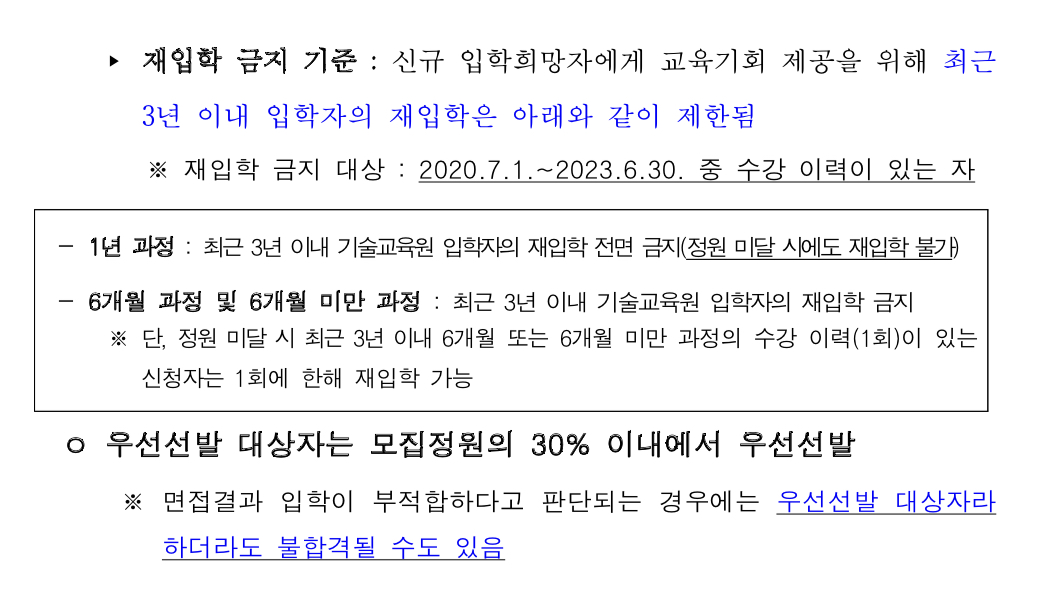 훈련생 정원의 30%는 사회적 배려층을 우선 선발하며, ▴국민기초생활보장법에 의한 수급권자 및 차상위계층 ▴국가유공자 ▴5·18 민주유공자 ▴사회복지시설 거주자 ▴한부모가족지원법에 따른 지원대상자 등입니다.