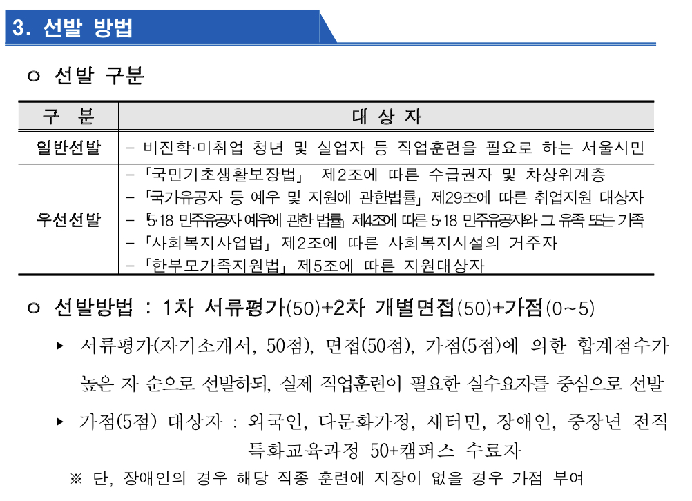 1차 서류전형(50점)과 2차 개별면접(50점)을 거쳐 최종 확정한다. 지원동기, 훈련의욕, 학과 적합성 등을 종합적으로 고려해 실제 직업훈련이 필요한 실수요자를 중심으로 선발할 예정이라고 합니다.