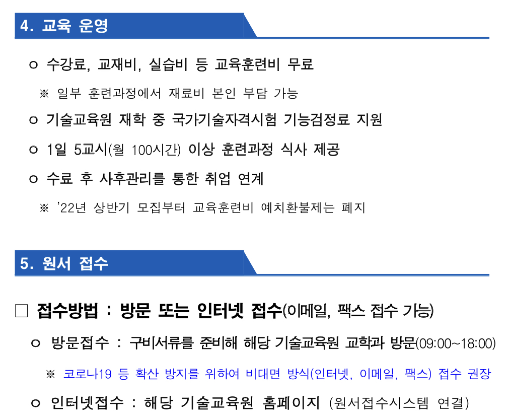 훈련에 필요한 수강료, 교재비, 수강기간 중 기능검정료 등 교육훈련비는 전액 무료며 기술교육원 재학 중 국가기술자격시험 기능검정료를 지원하고 1일 5교시 이상 교육이 진행될 경우 식사도 제공한다. 수료 후에는 훈련생 사후관리를 통해 취·창업 지원 등의 서비스도 받을 수 있습니다.