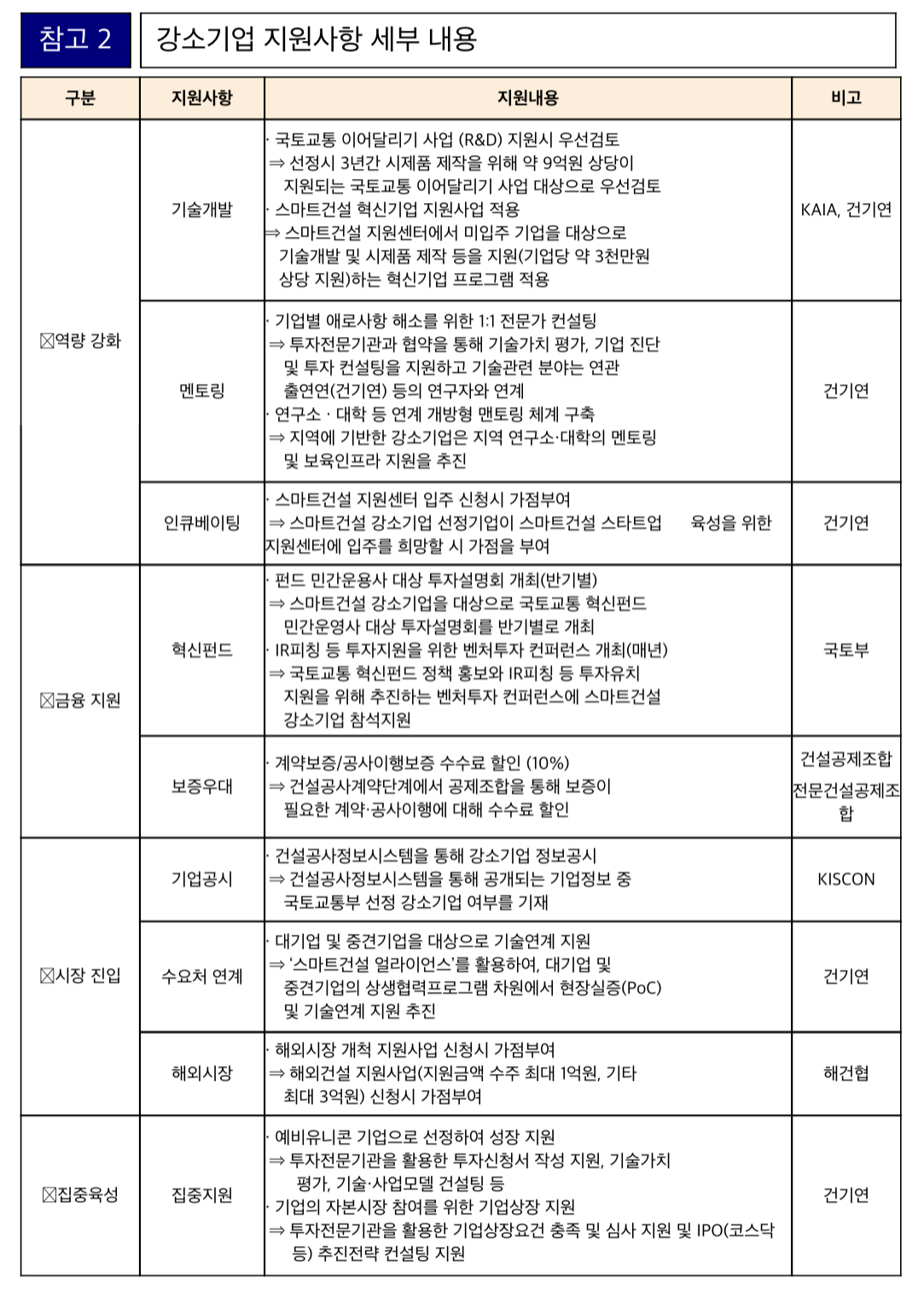 (시장진입) 기술중심의 강소기업들이 활발히 기업활동을 할 수 있도록 기술이 필요한 대기업 등과 연계를 추진하고 건설공사정보시스템을 통해 강소기업 선정여부를 적극 홍보할 수 있도록 한다고 합니다.