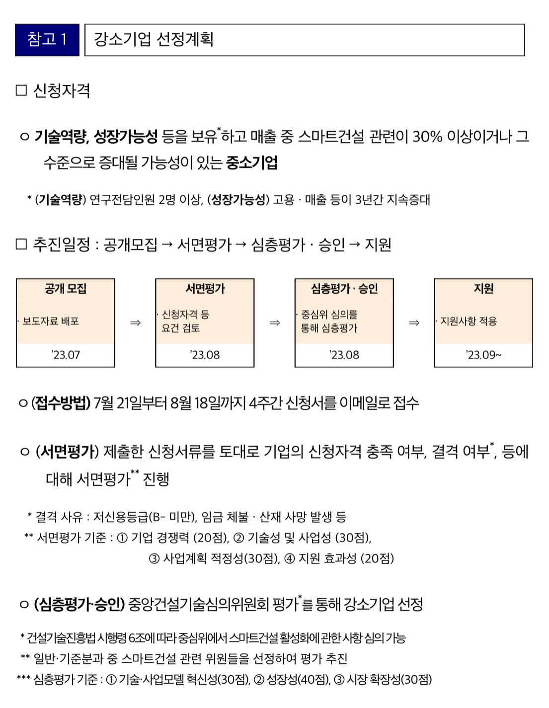 스마트건설 강소기업 선정을 희망하는 기업들은 2023년 7월 21일부터 8월 18일(금)까지 모집공고문에 첨부된 신청서를 전자우편을 통해 제출할 수 있으며 공고문은 한국건설기술연구원 누리집(http://kict.re.kr)에서 확인할 수 있습니다.