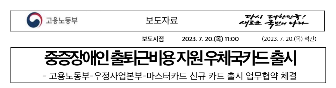 고용노동부(장관 이정식)와 우정사업본부(우정사업본부장 직무대리 박인환), 마스터카드 코리아(대표이사 최동천)는 중증장애인 근로자 출퇴근 교통비 지원사업을 활성화하기 위해 2023년 7월 20일(목) 전용 카드 신규 출시 업무협약(MOU)을 체결하였다고 밝혔습니다.