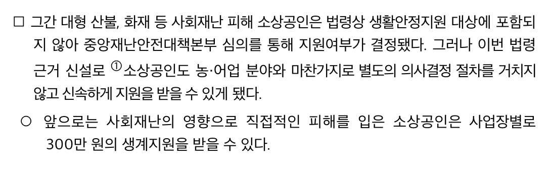 이 개정안은 주택 또는 농·어업 피해자로 한정돼 있던 생활안정 지원 대상에 소상공인을 추가한 것이 골자라고 합니다.
