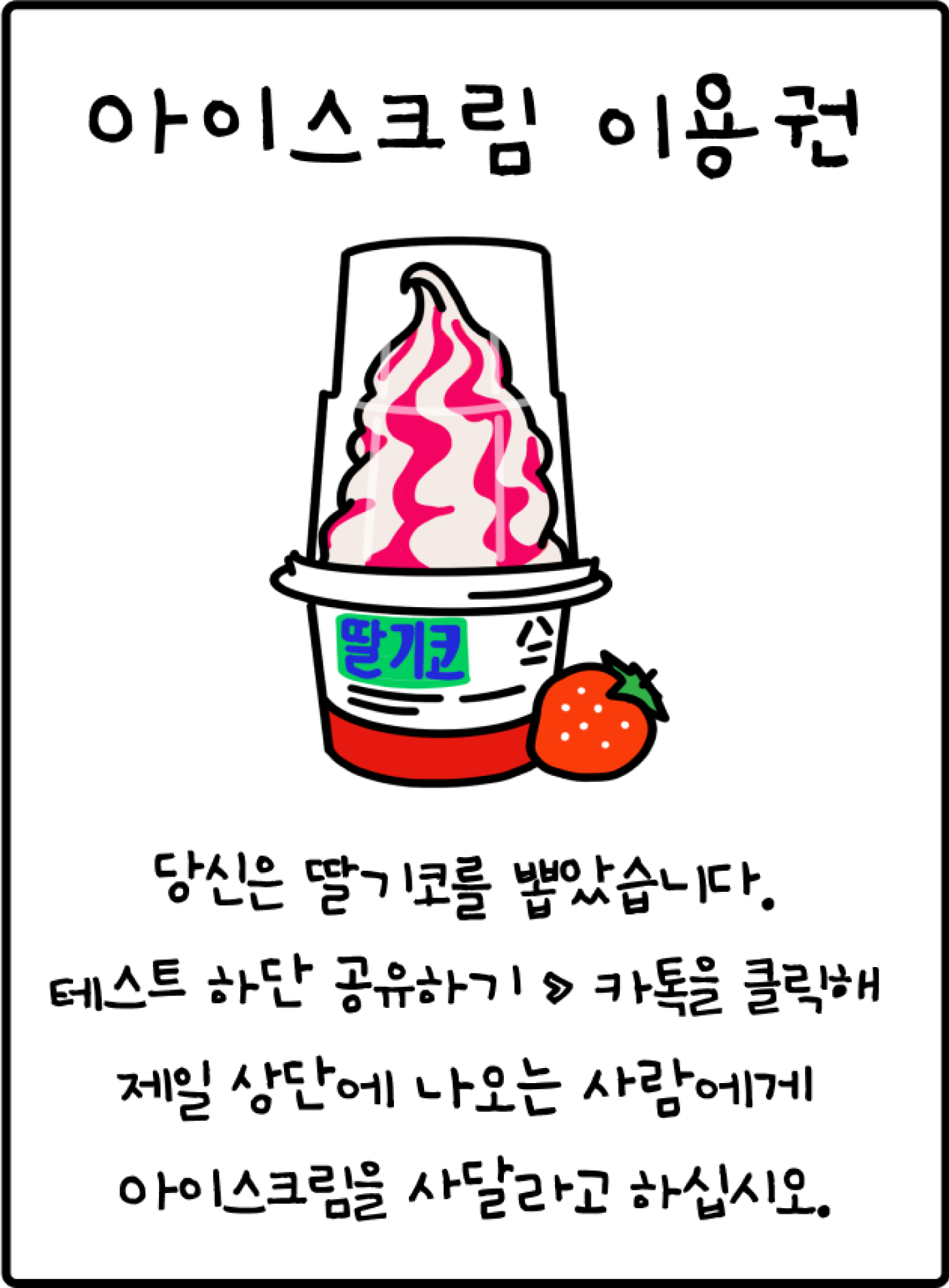 테스트 하단 공유하기 > 카톡을 클릭해 제일 상단에 나오는 사람에게 아이스크림을 사달라고 하십시오.