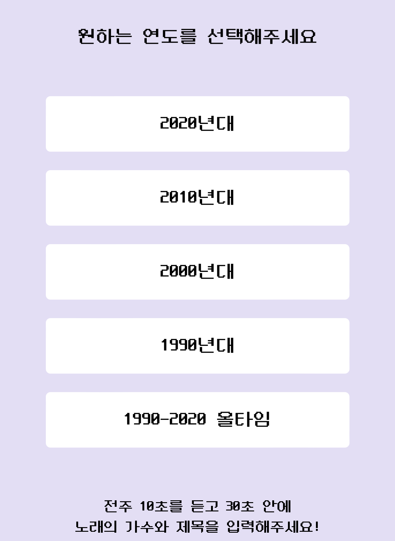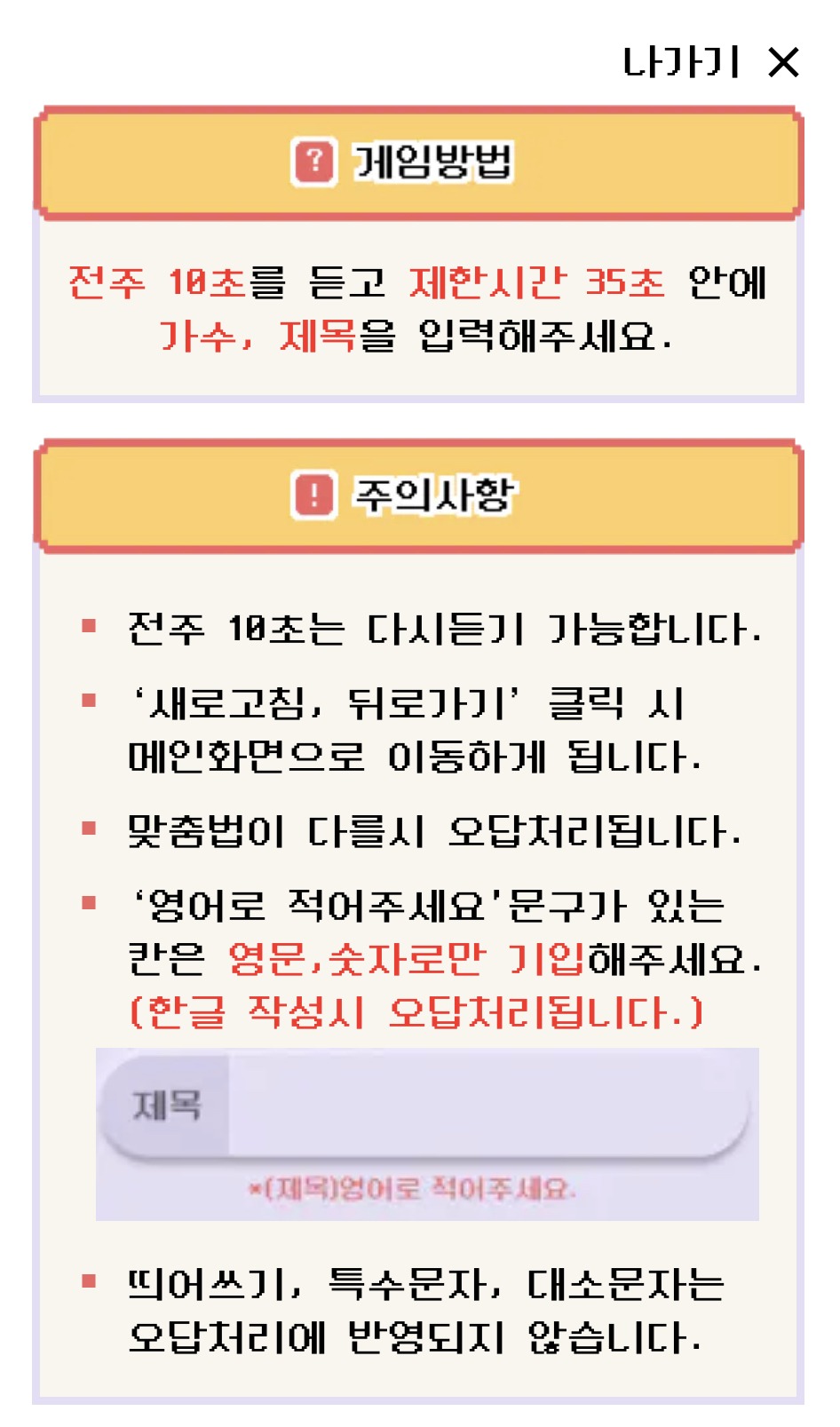 전주 10조를 듣고 30조 안에 노래의 가수와 제목을 입력해 주세요 선택을 하면 게임이 시작됩니다.