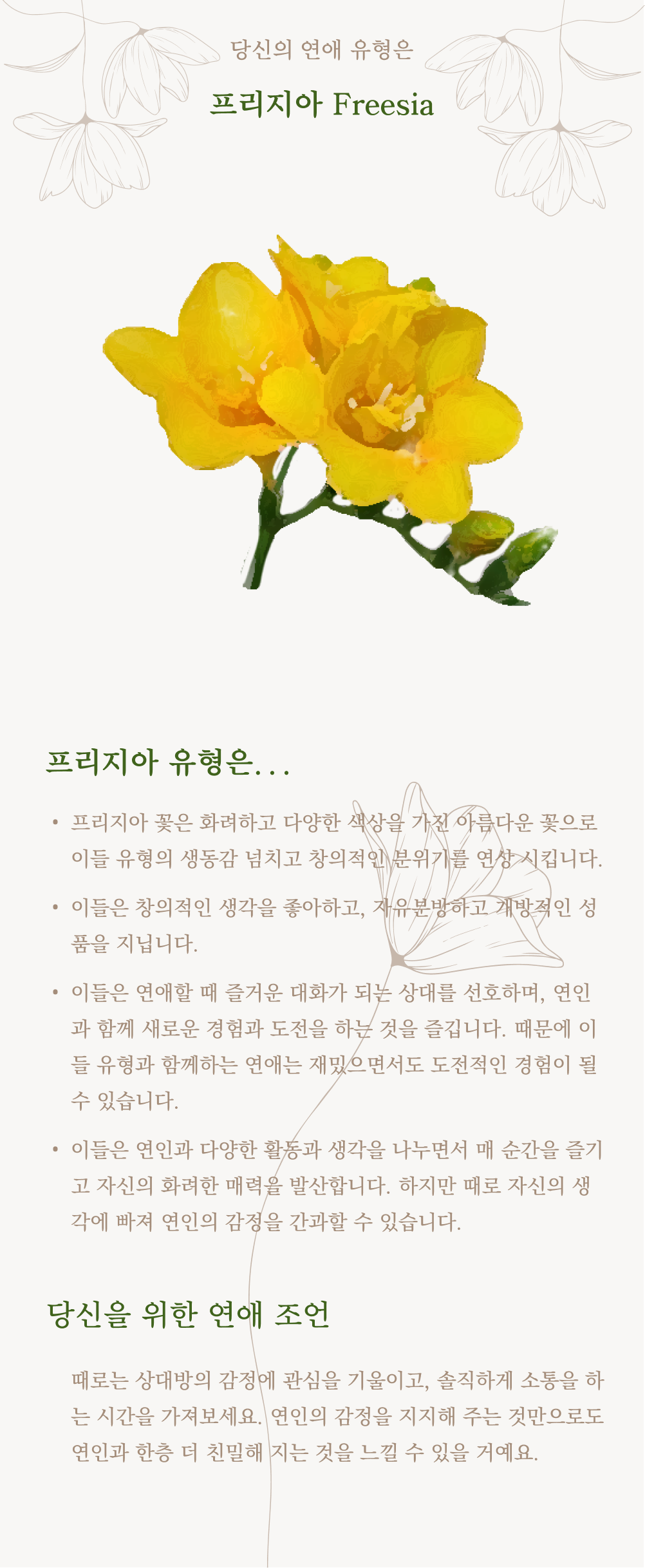 당신의 연애 유형은 프리지아(Freesia)가 나왔습니다.