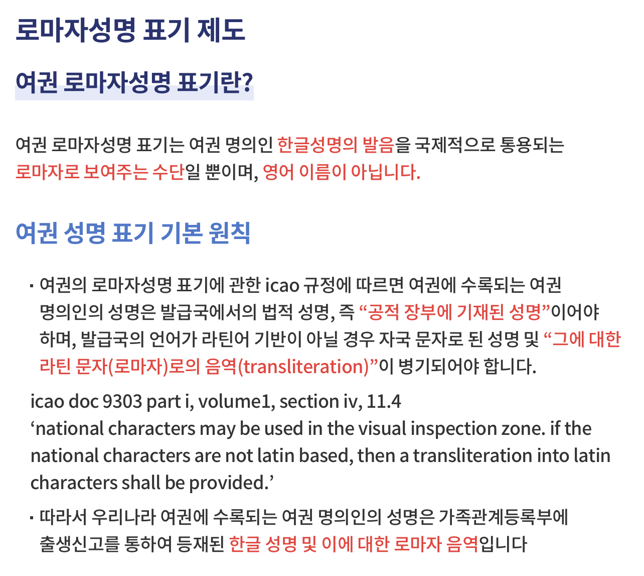 • 여권의 로마자성명 표기에 관한 icao 규정에 따르면 여권에 수록되는 여권 명의인의 성명은 발급국에서의 법적 성명, 즉 “공적 장부에 기재된 성명”이어야 하며, 발급국의 언어가 라틴어 기반이 아닐 경우 자국 문자로 된 성명 및 “그에 대한 라틴 문자(로마자)로의 음역(transliteration)”이 병기되어야 합니다.