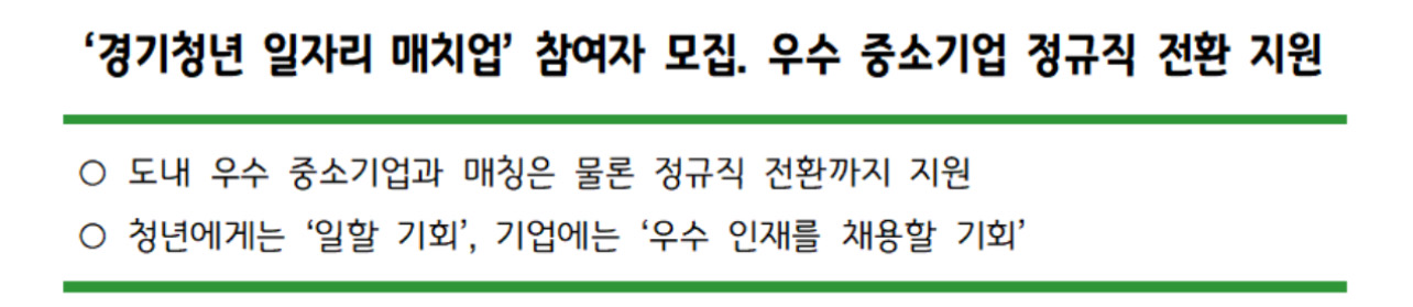 ‘경기청년 일자리 매치업 사업’은 도내 미취업 청년과 구인난을 겪는 중소기업 간 일자리 미스매치 문제를 해소하기 위해 경기도가 2021년부터 추진한 사업입니다.